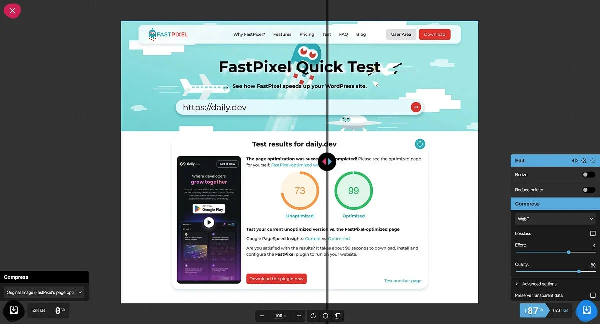 这听起来显而易见,却是大多数人跳过的步骤。 从数码相机或iPhone上传一张4000像素宽的照片,让WordPress将其缩小,这种做法并非图片优化。浏览器仍然会下载完整尺寸的文件,相当于把3MB的图片强行塞进更小的容器中。 正确的做法是在上传前调整尺寸。先了解主题内容区的最大显示宽度(通常在800px到1200px之间,取决于所使用的主题),然后在图片进入媒体库之前将其调整到对应尺寸。Squoosh等工具可以直接在浏览器中完成调整,无需安装软件,还能比较不同压缩设置下的画质差异。 如果媒体库中已有图片,换主题后可以注册新的图片尺寸,然后使用免费的Regenerate Thumbnails插件重新生成缩略图。